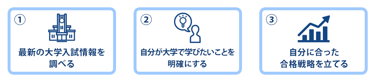 まずはどのような総合型・学校推薦型選抜があるのか、大学ごとにポイントを知り、入試情報の収集・分析から始めていきましょう。