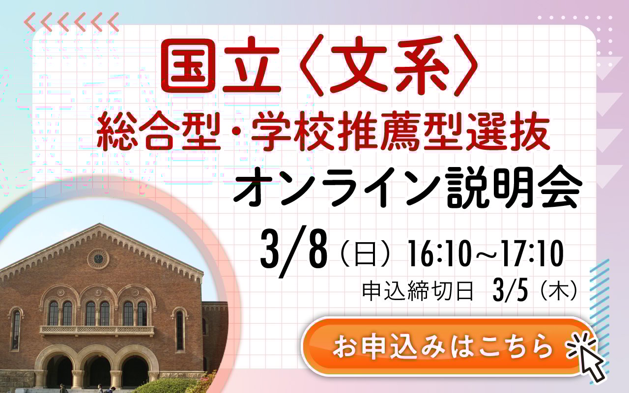 私大 総合型・学校推薦型選抜で合格実績No.1を誇る早稲田塾が、国立(文系)の総合型選抜を徹底解説!実際に合格した先輩の出願例なども交えながら、総合型選抜に向けてやるべきことをお伝えします。