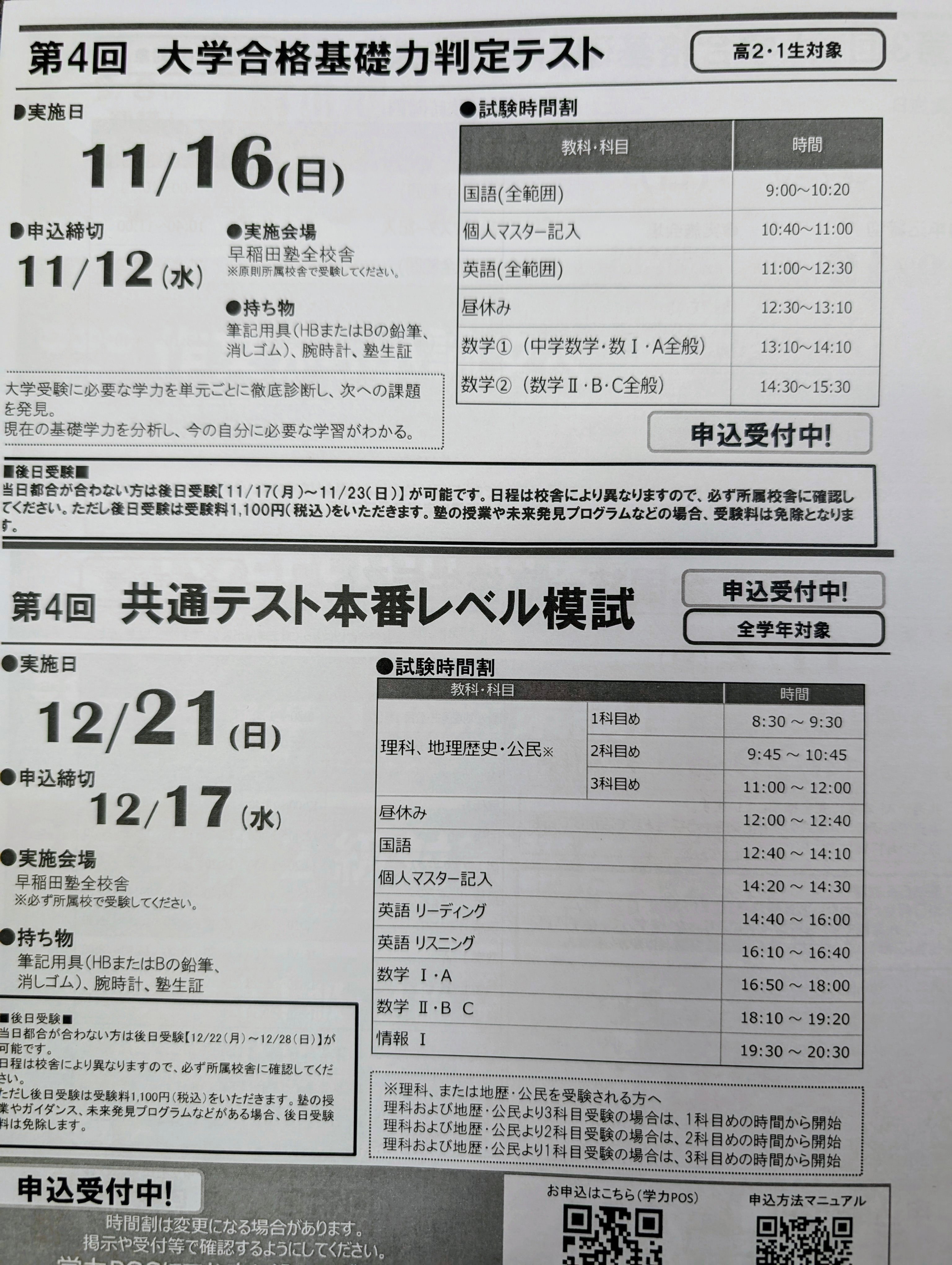 早稲田塾吉祥寺校担任助手の伊庭心春です。(上智大学総合人間科学部心理学科1年・光塩女子学院高等科出身)今回は11/16(日)開催予定の第4回大学合格基礎力判定テストのお知らせです。