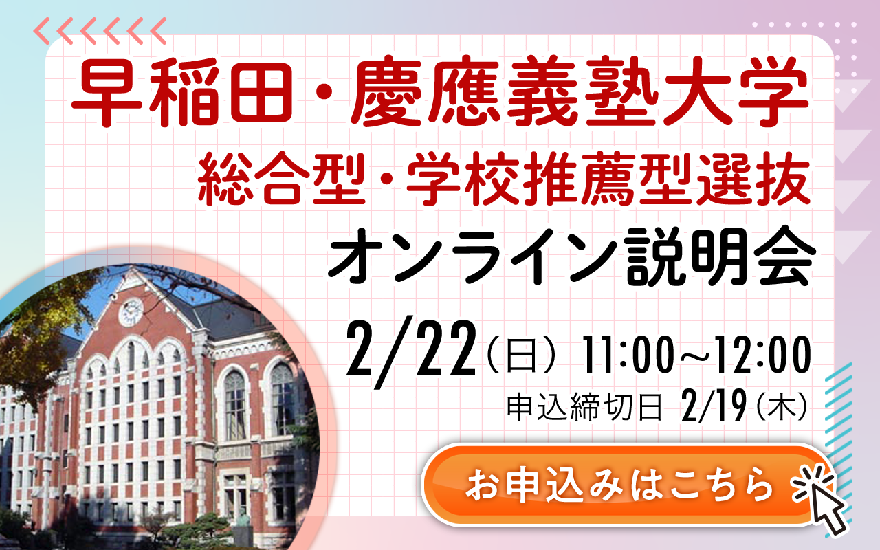 私大 総合型・学校推薦型選抜で合格実績No.1を誇る早稲田塾が、早慶の総合型選抜を徹底解説!実際に合格した先輩の事例なども交えながら、入試のポイントをお伝えします。