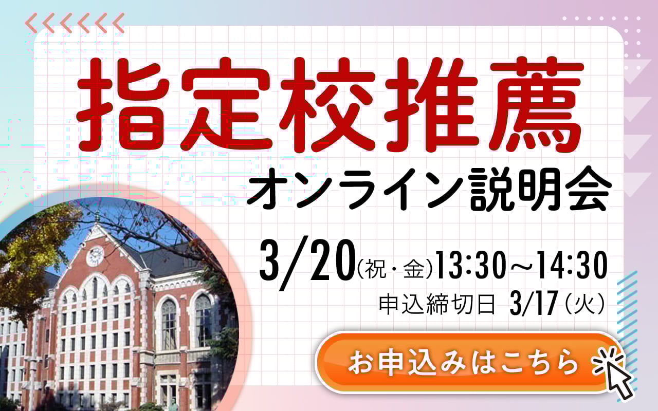 私大 総合型・学校推薦型選抜で合格実績No.1を誇る早稲田塾が、指定校推薦について徹底解説!実際に合格した先輩の出願例なども交えながら、入試に向けてやるべきことをお伝えします。