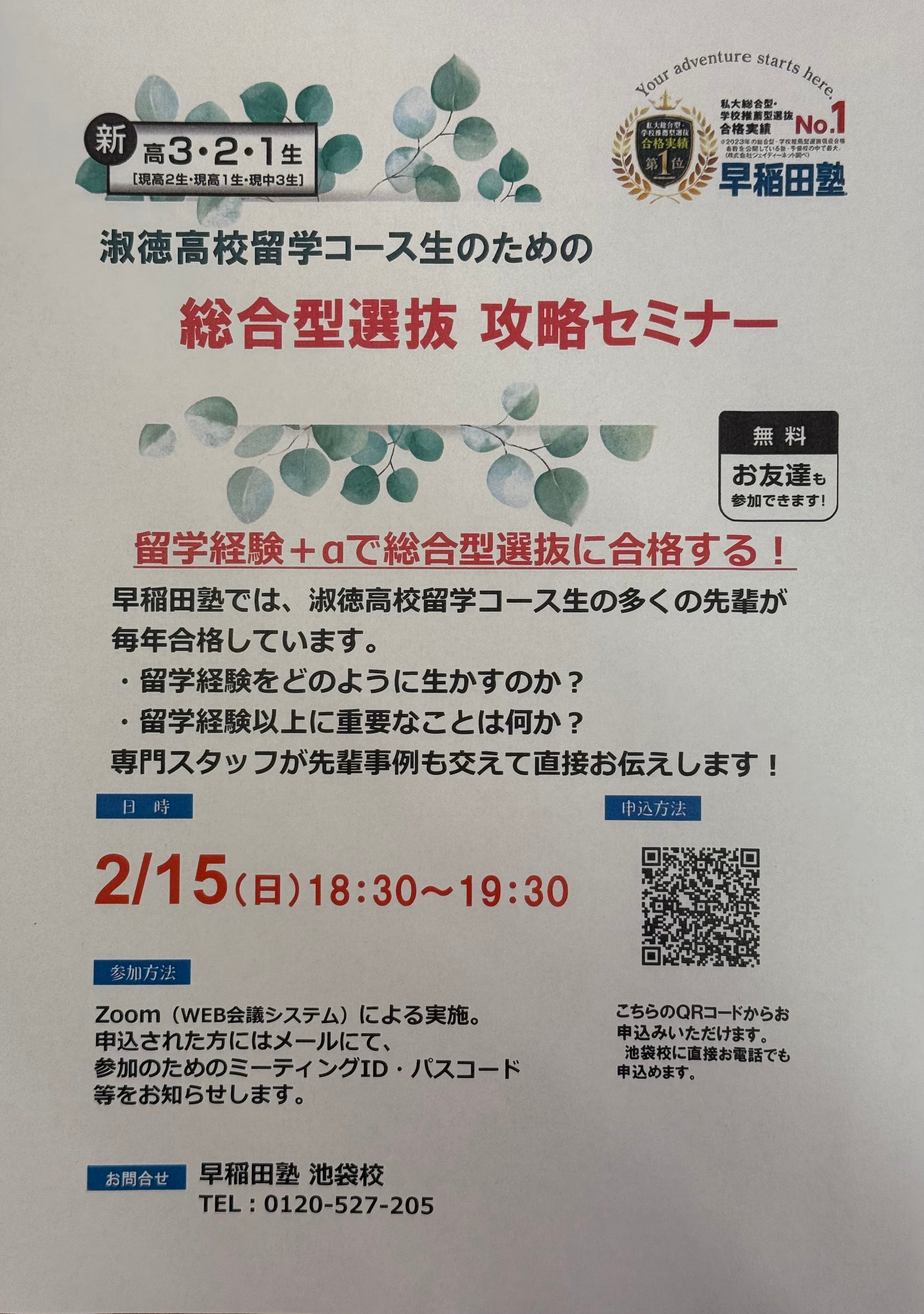 毎回たくさんのお申込みをいただく【1日体験】総合型選抜・学校推薦型選抜 特別指導<入門編>ですが、2月15日(日)に藤沢校にて、対面での開催が決定いたしました!