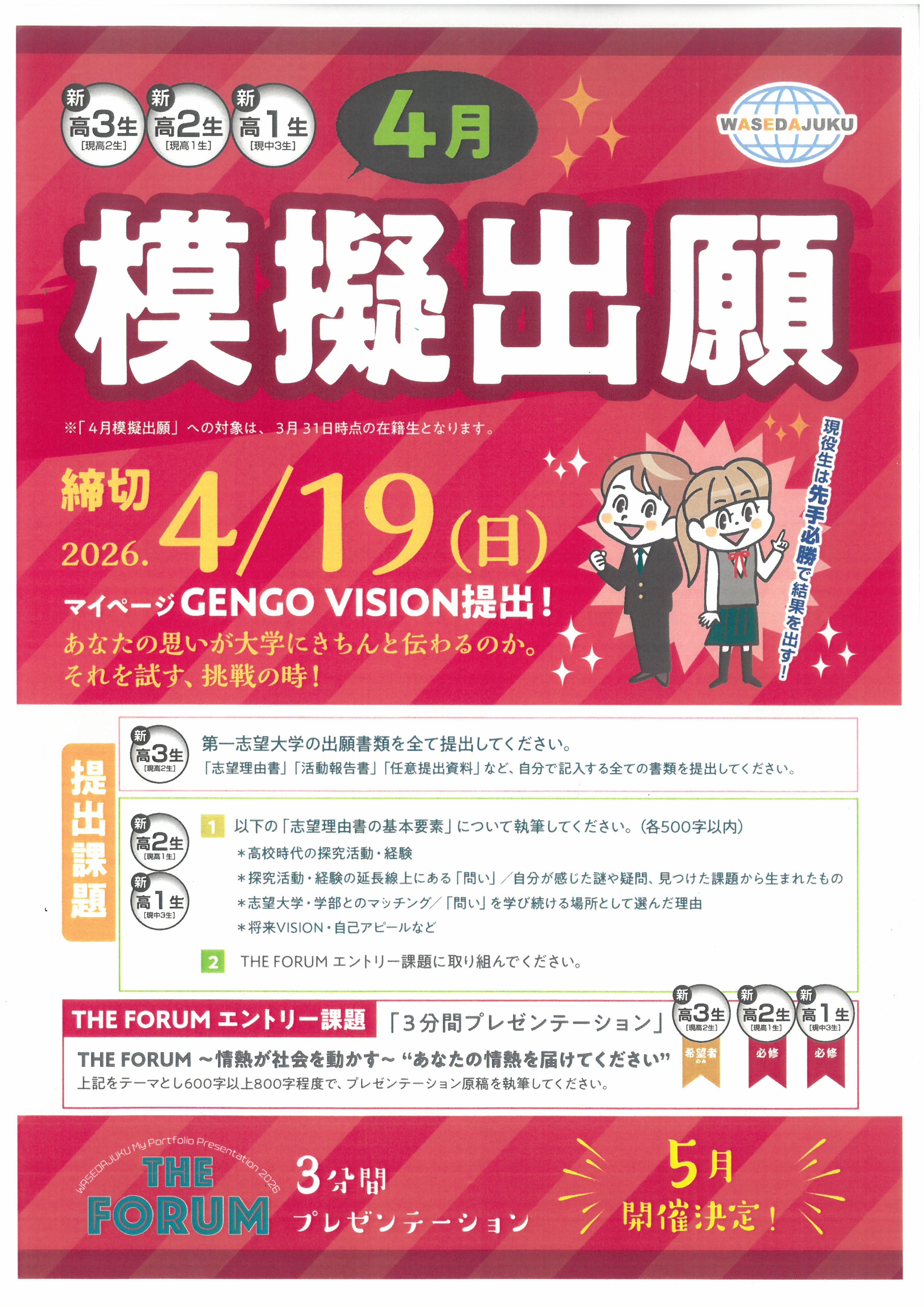 皆さんこんにちは、青葉台校担任助手です。今回は、本日4月19日(日)締め切りの【模擬出願】をこの先どう活かしていくかについて載せていますので、ぜひご覧ください!