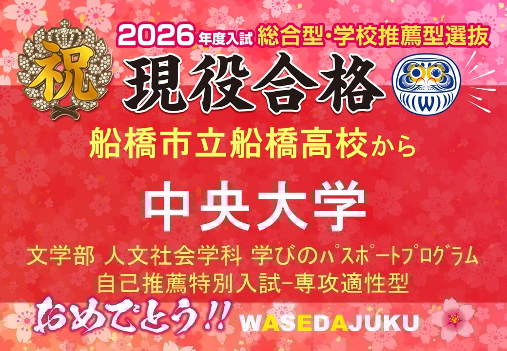 早稲田塾津田沼校より、現役合格速報です!船橋市立船橋高校から、中央大学文学部へ自己推薦特別入試で現役合格!