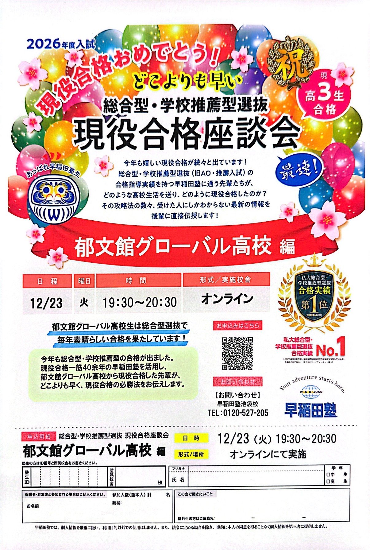 みなさんこんにちは!早稲田塾町田校担任助手の齊木りさ(早稲田塾45期生、慶應義塾大学法学部法律学科2年、日本女子大学附属高等学校卒)です。今回は、【大妻多摩高校生のための総合型・学校推薦型選抜 攻略セミナー】 開催のお知らせです!