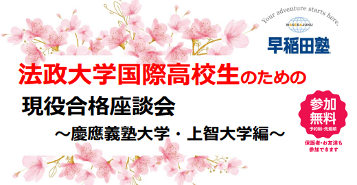 こんにちは!早稲田塾横浜校担任助手の松岡杏梨(上智大学総合グローバル学部2年・横浜国際高等学校卒・早稲田塾45期生)です!今回は横浜校でオンライン開催が決定した、「法政国際生のための内部進学&総合型両立セミナー」についてお知らせします!