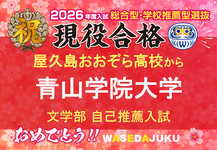 藤沢校、本日早速嬉しい報告が来ました!湘南学園高校から、青山学院大学地球社会共生学部に自己推薦入試で現役合格!