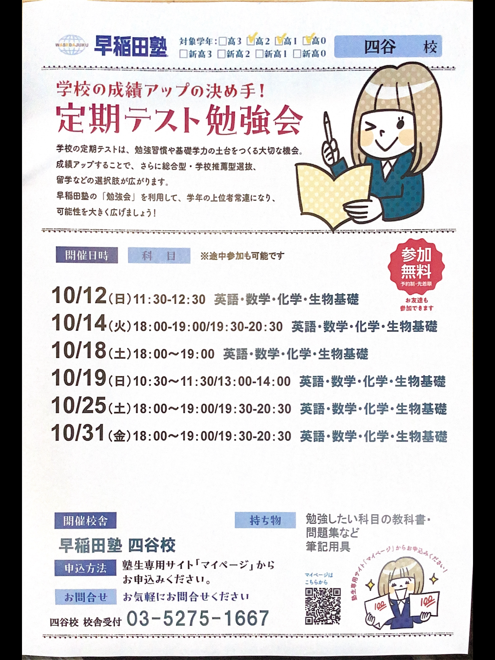 定期テストは受験に直結する大切なものです!!早稲田塾を活用して、成績アップを目指してください!