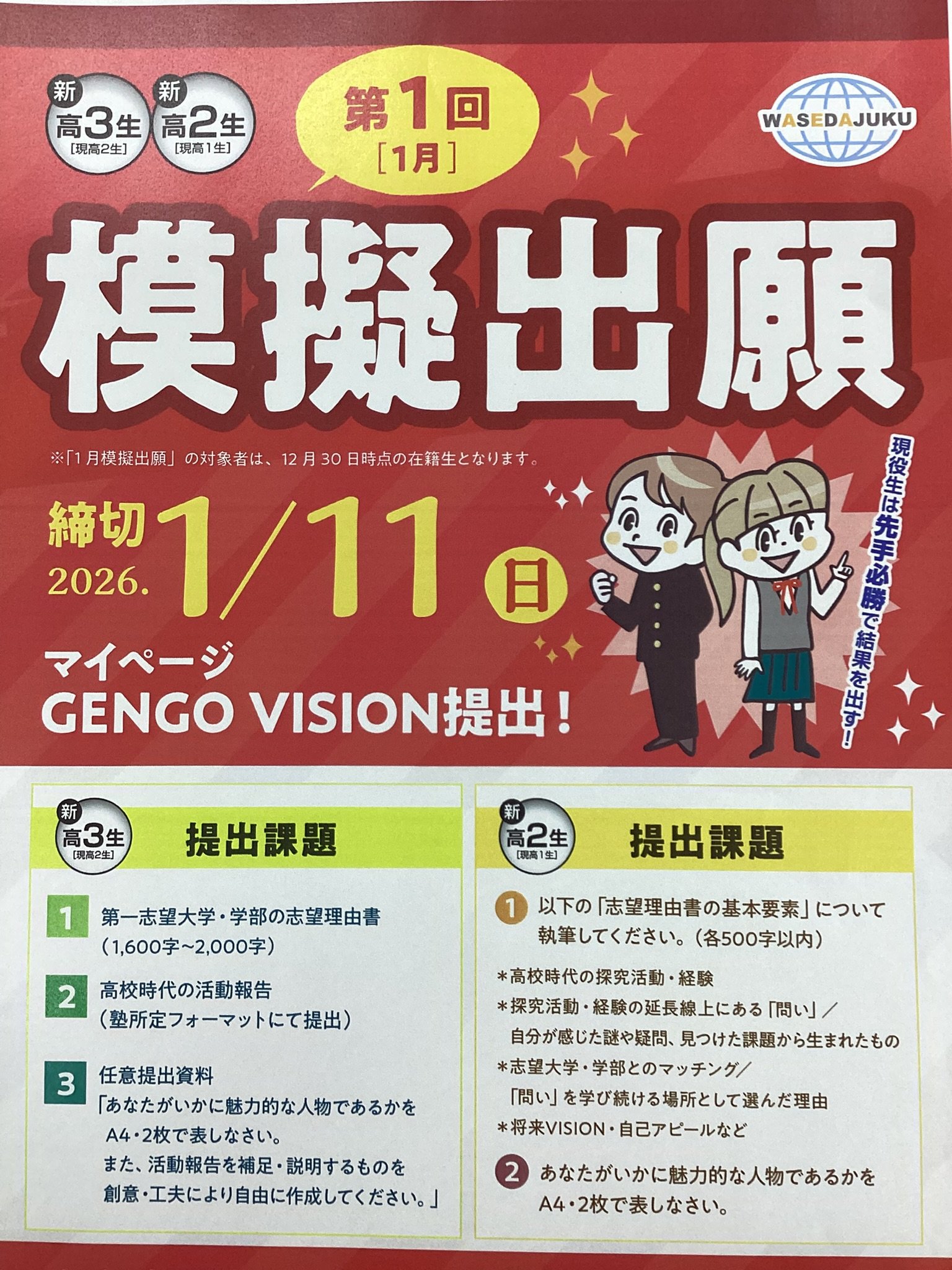 一方新高2生は9月の模擬出願の時と基本的には同じ題意で「志望理由書の基本要素」を要素ごとに500字以内で執筆するといった内容です。