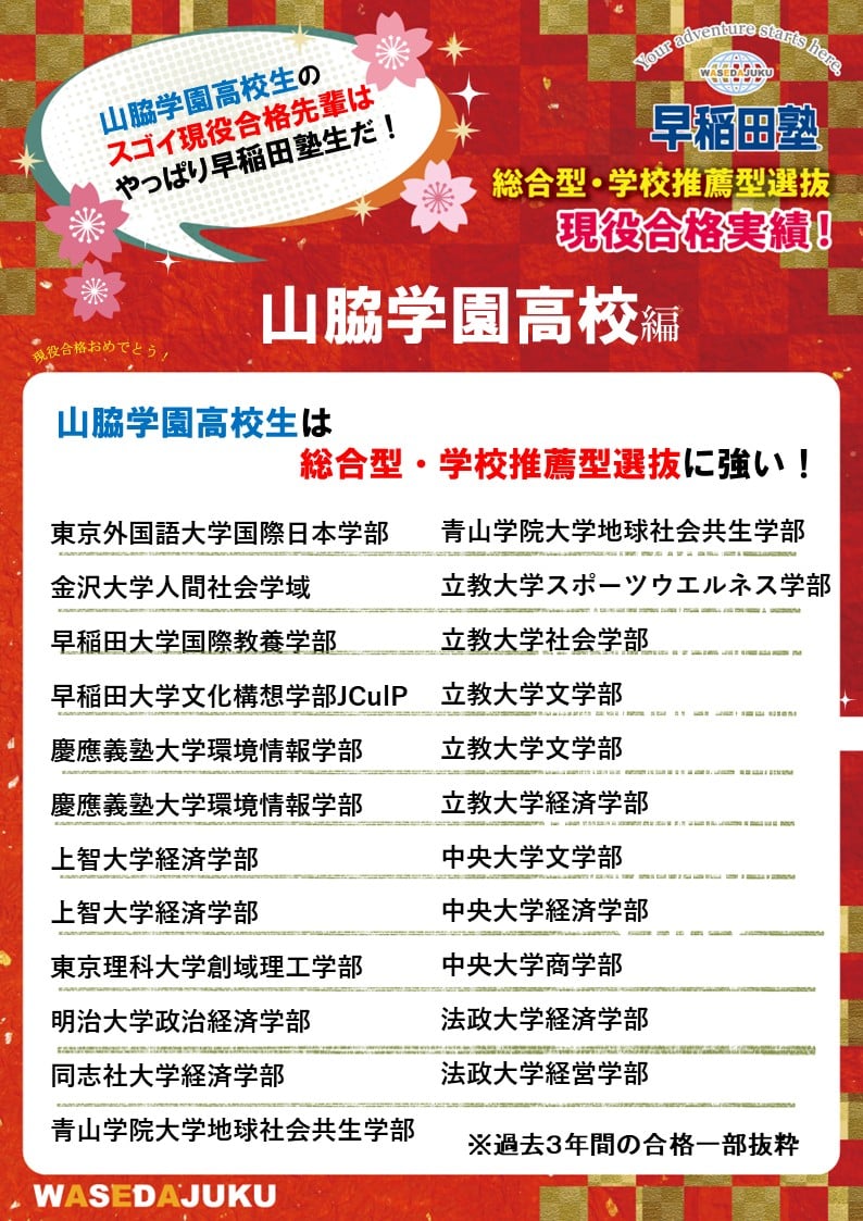山脇学園高校から、毎年総合型・学校推薦型選抜で国公立・早慶上智・明青立法中の現役合格が出ています。