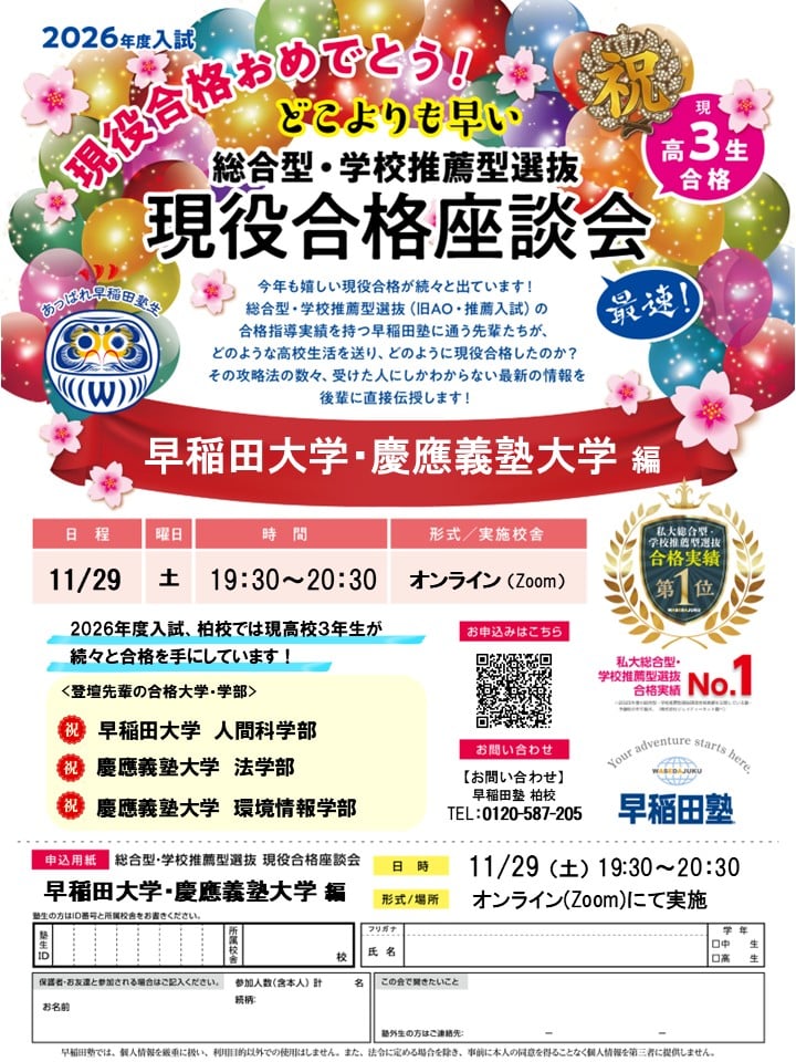 ☆興味がある方は、ぜひ早稲田塾柏校(電話番号:0120-587-205)までお電話ください!