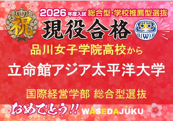 品川女子学院高校のA.Aさん、立命館アジア太平洋大学 国際経営学部 国際経営学科に総合型選抜で見事現役合格です。