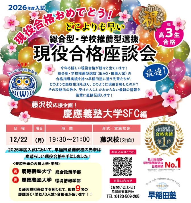 「どこよりも早い!総合型・学校推薦型選抜 現役合格座談会~慶應SFC編~」を開催します。