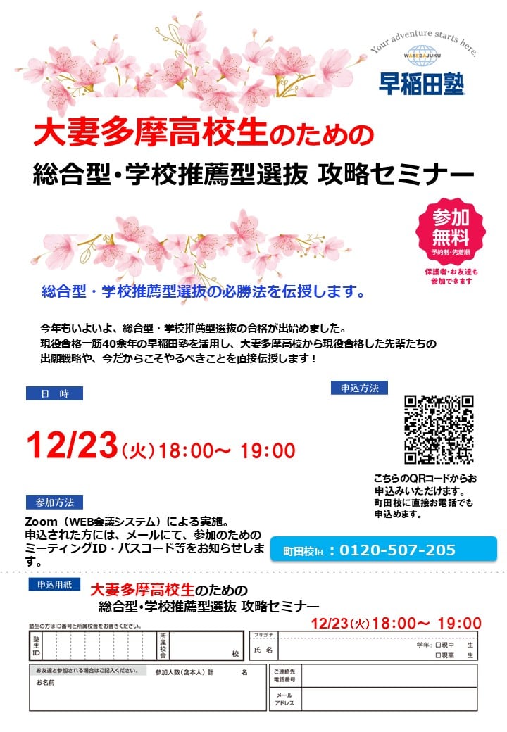 今回は、【大妻多摩高校生のための総合型・学校推薦型選抜 攻略セミナー】 開催のお知らせです!