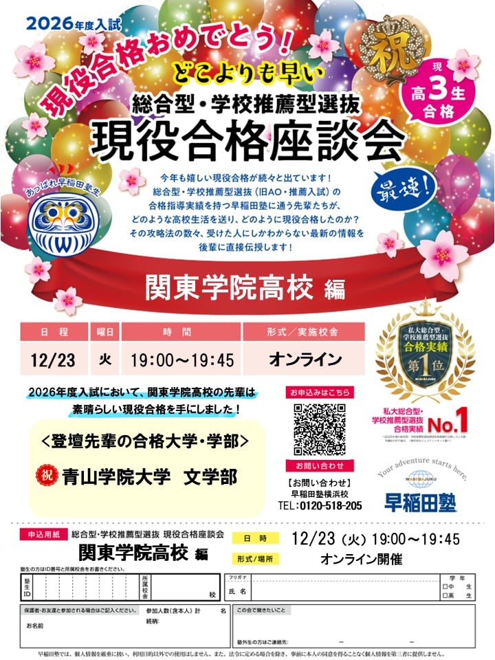 低学年からの塾の活用方法をはじめとして、指定校と総合型選抜の両立など、関東学院高校生の方にお伝えしたい内容が盛りだくさんとなっています!