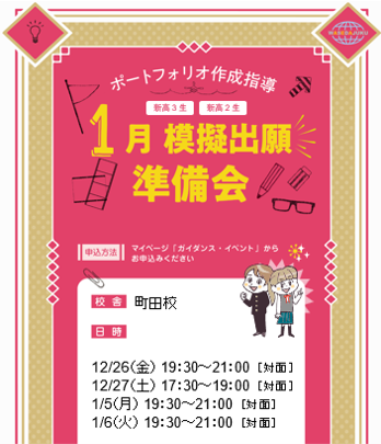 また、町田校では模擬出願準備会の開催が決まっています!新高校2年生は講座での復習が難しいので、積極的に参加してみましょう!!