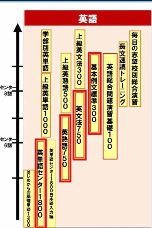 例えば、英語では、下の写真の赤枠部分が英語力の基礎や土台となりますが、共通テスト8割や英検準1級を目指すには上級まで進む必要があります!!