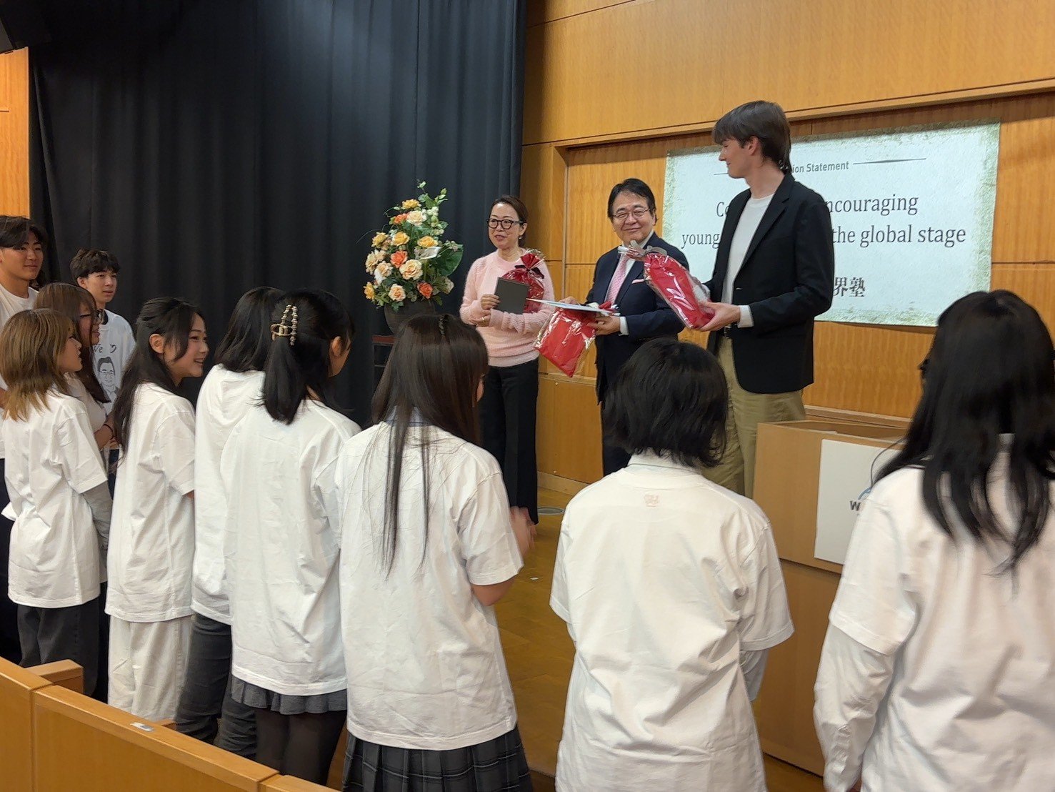 休憩の後は、世界塾生から先生方へのサプライズ!メッセージボートと、塾生たちが作った世界塾特製Tシャツを先生方へプレゼントします。