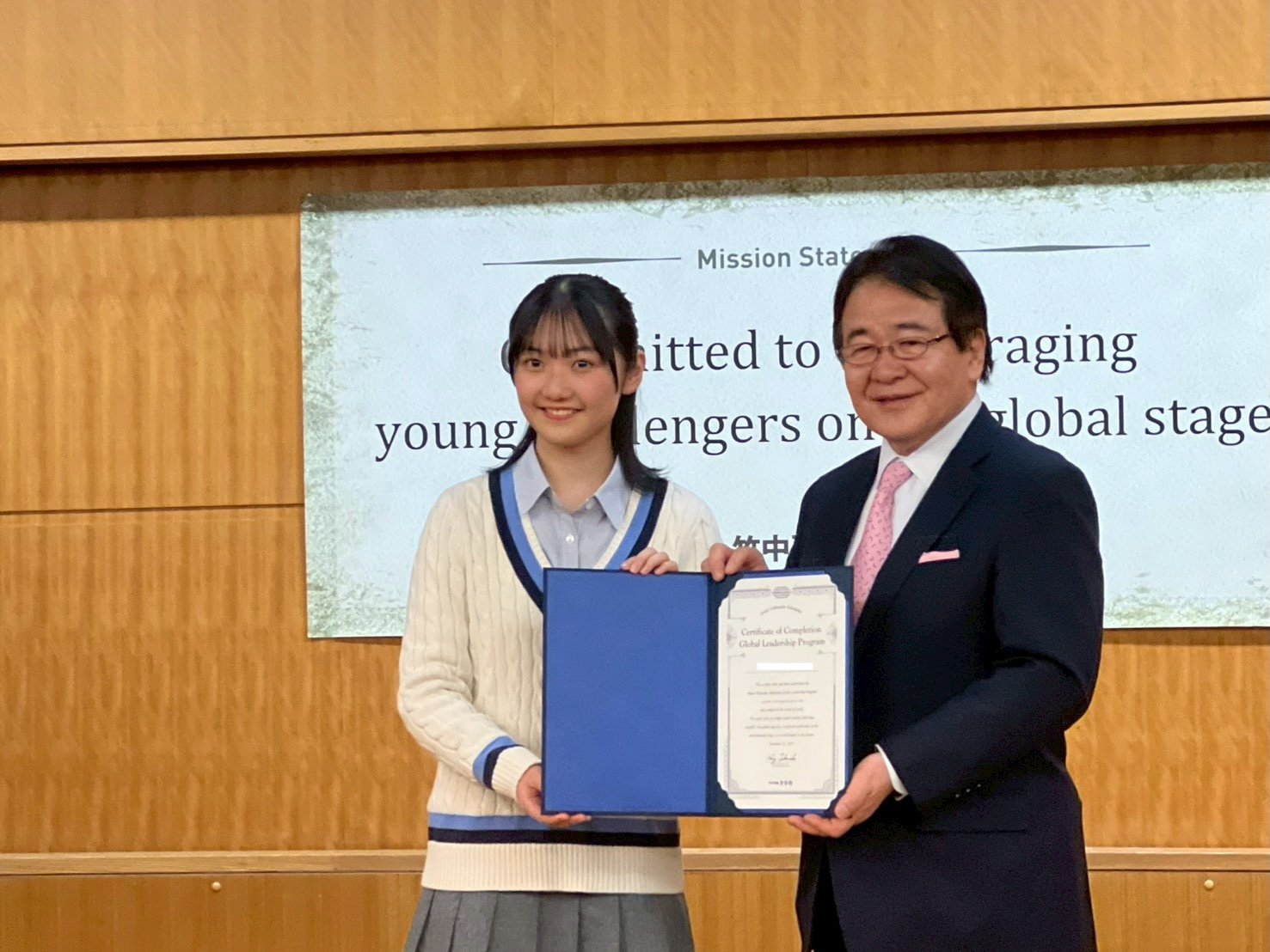 最後には、竹中先生から塾生たちに修了証が手渡されます。これまで、さまざまな課題を乗り越えてきました。英語でのプレゼンテーション、自分の研究テーマに関する発表。竹中先生と現代社会について真剣に語り合う、大学や大学院のゼミのような環境の中で、塾生たちの視座は大きく引き上げられました。