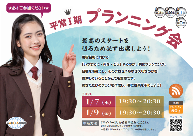 このプランニング会では、平常授業の時間割・スケジュールの確認に加えて、「いつまでに・何を・どう」やるのかを一緒にプランニングしていきます!あなただけのプランを作成し、春に成果を手にしましょう!