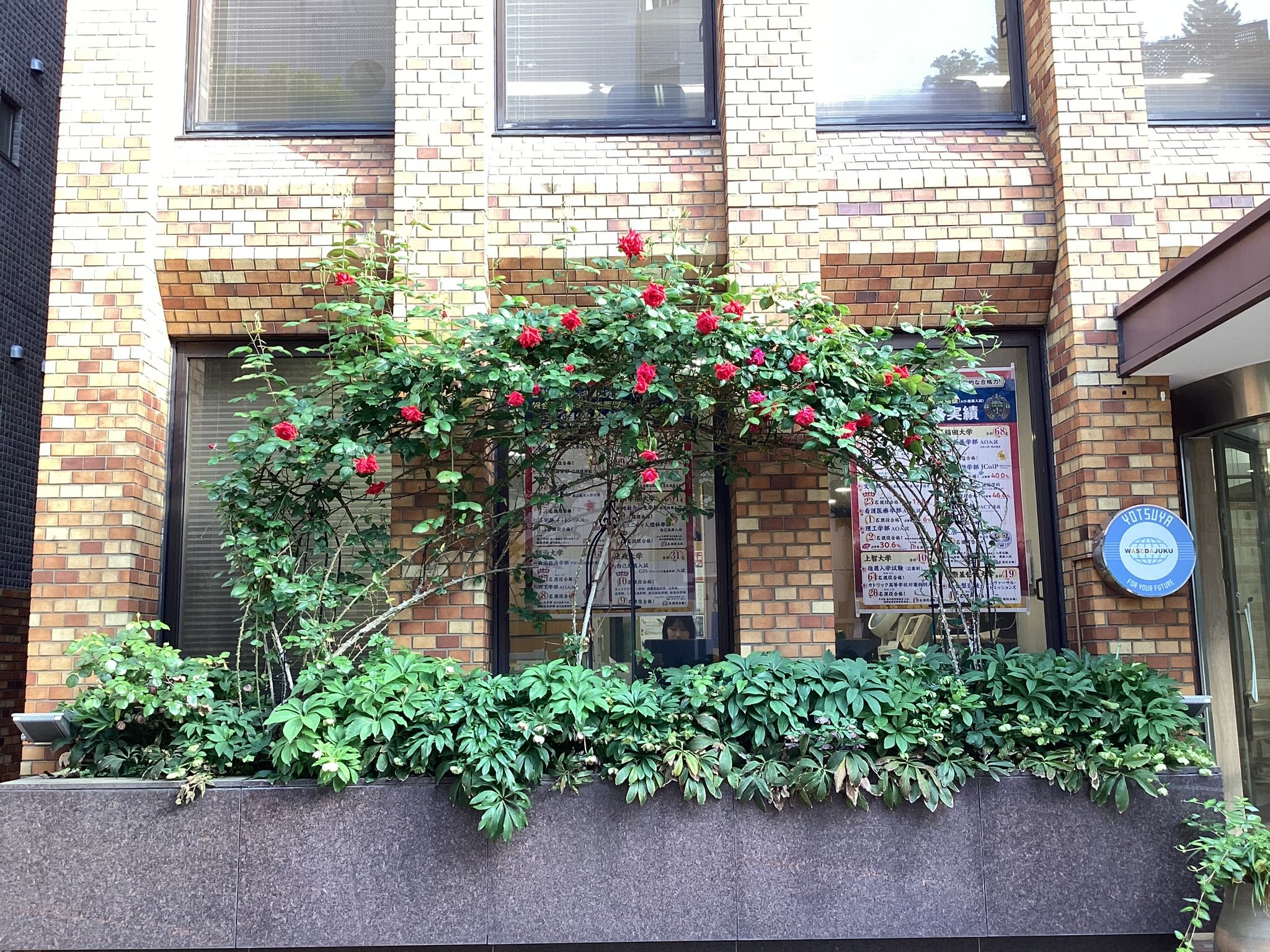 早稲田塾四谷校は四ツ谷駅から徒歩5分近くにあり、落ち着いた環境の中で自分と向き合い、目標達成に必要な力を極めていくことができます。入り口の花壇にはバラが複数あり、5月には毎年とても素敵な花を咲かせます。冬は塾の入り口に白い椿が咲き、一年中きれいな花が塾生の皆さんを見守っている校舎です。