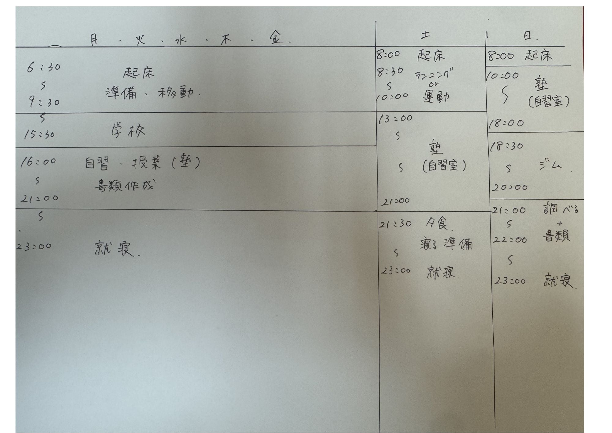 Q、もしよければ、1週間のスケジュール教えて欲しいです