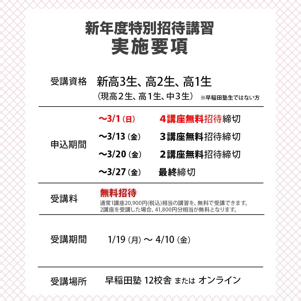 3/1(日)までのお申し込みで、早稲田塾の授業4講座分を無料で体験することができます。