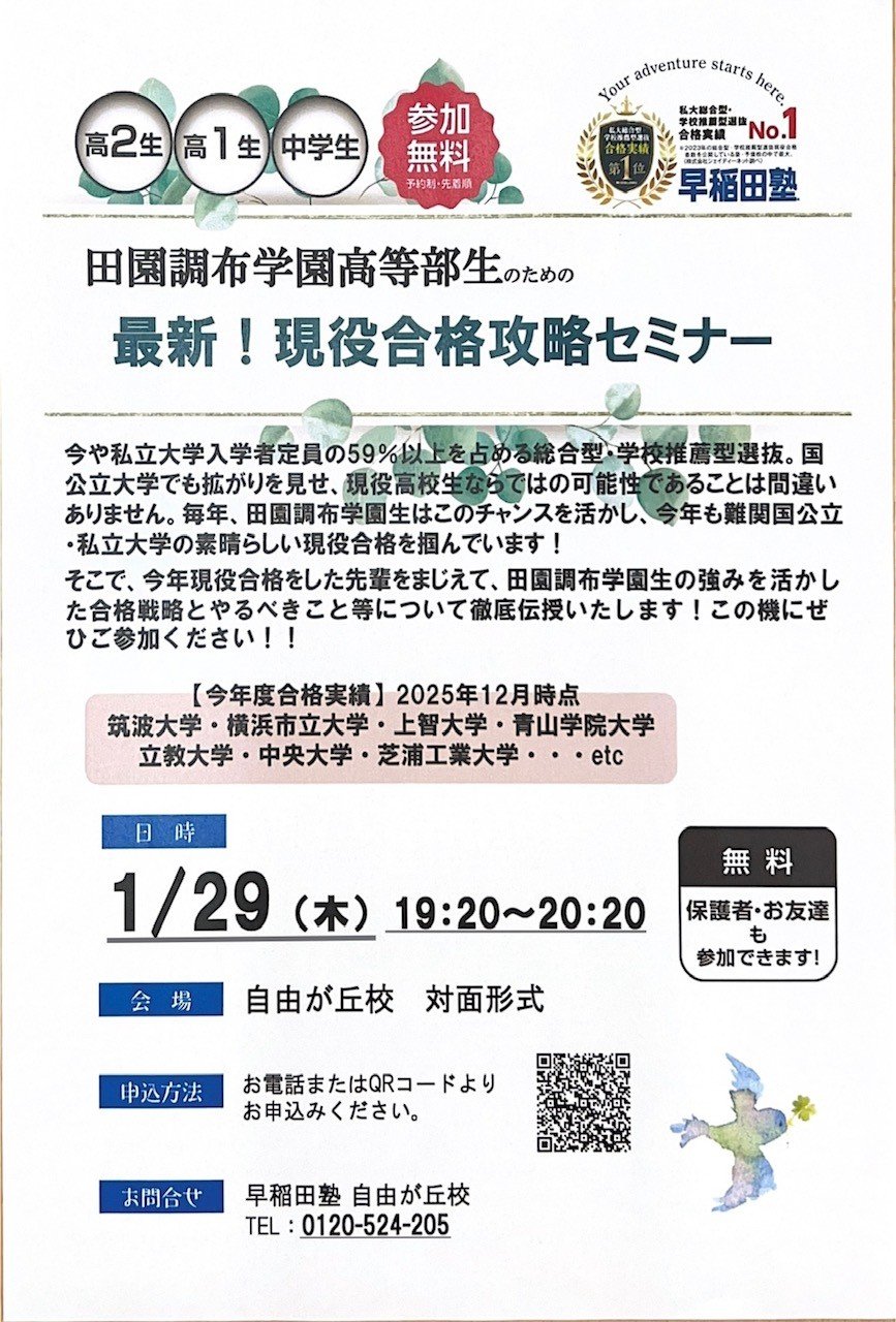 来る1/29(木)19:20~20:20にて、「田園調布学園高等部生のための最新!現役合格攻略セミナー」を開催します!