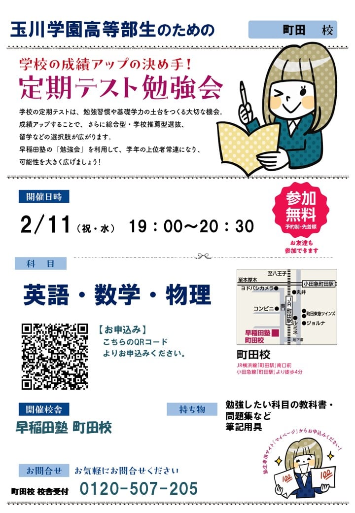 2/15(日)の17:00~18:00オンラインにて、「玉川学園高等部生のための定期テスト勉強会」を実施します!