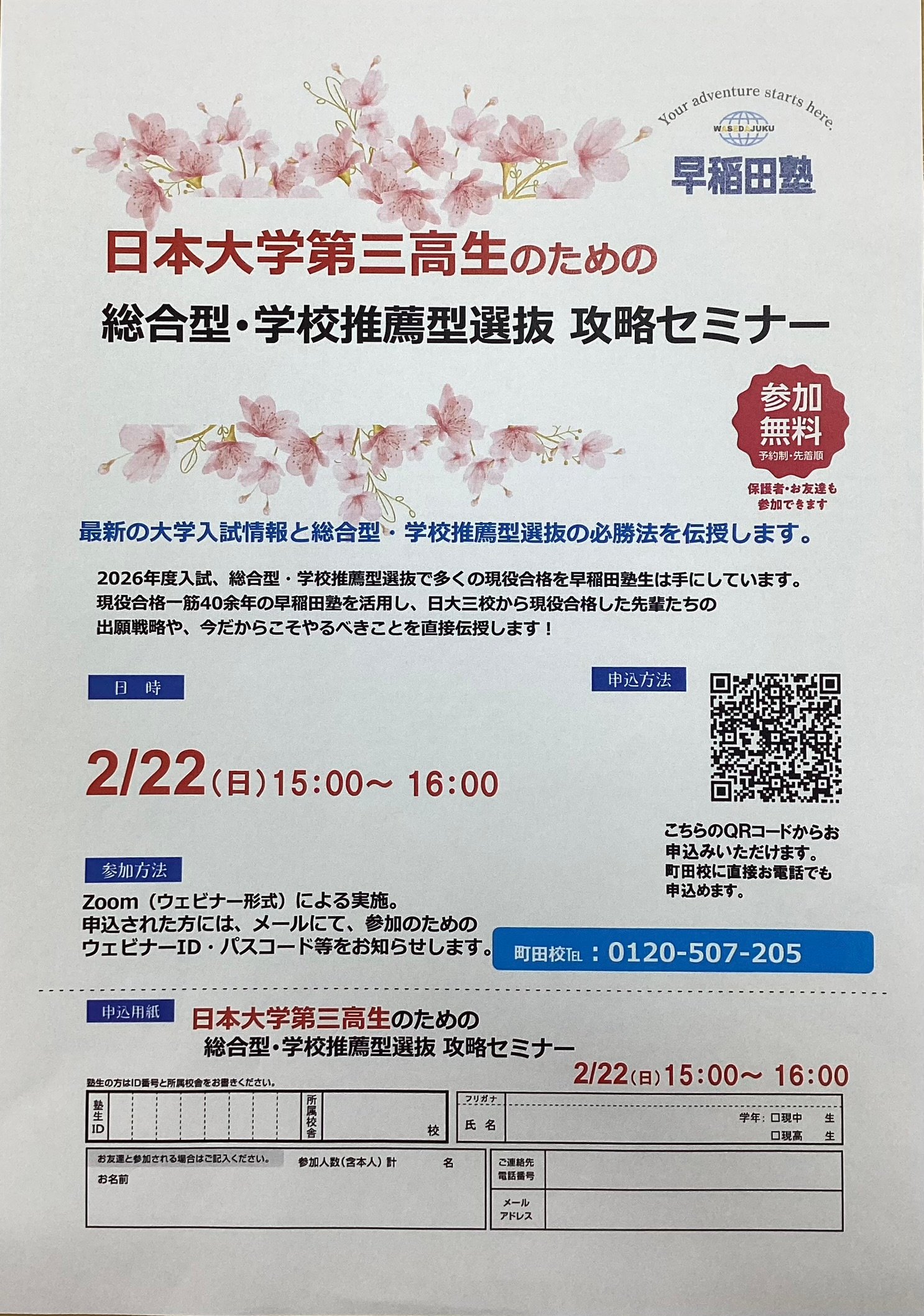 2/22(日)15:00~16:00オンラインにて、日本大学第三高生のための総合型・学校推薦型選抜攻略セミナーを実施します!