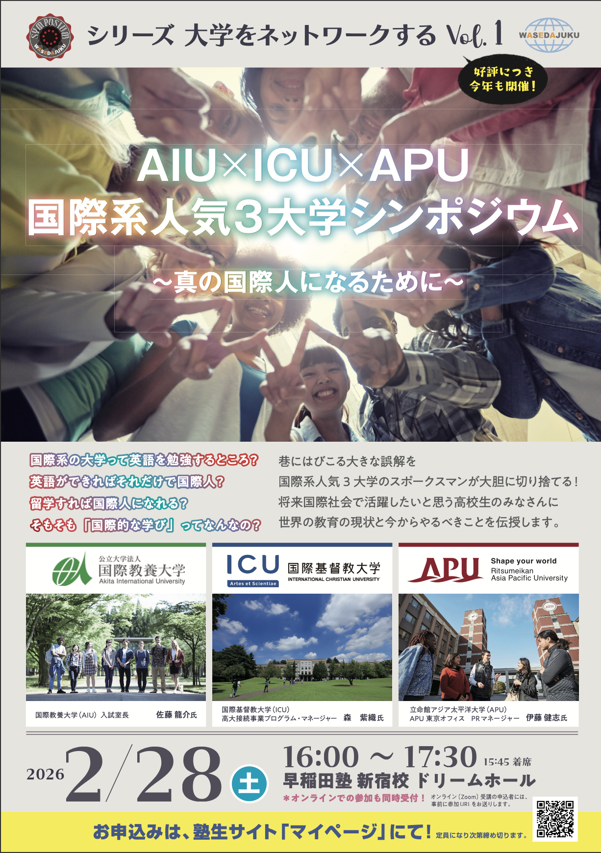 来る2月28日、早稲田塾新宿校にて「AIU×ICU×APU 国際系人気3大学シンポジウム」が開催されます!