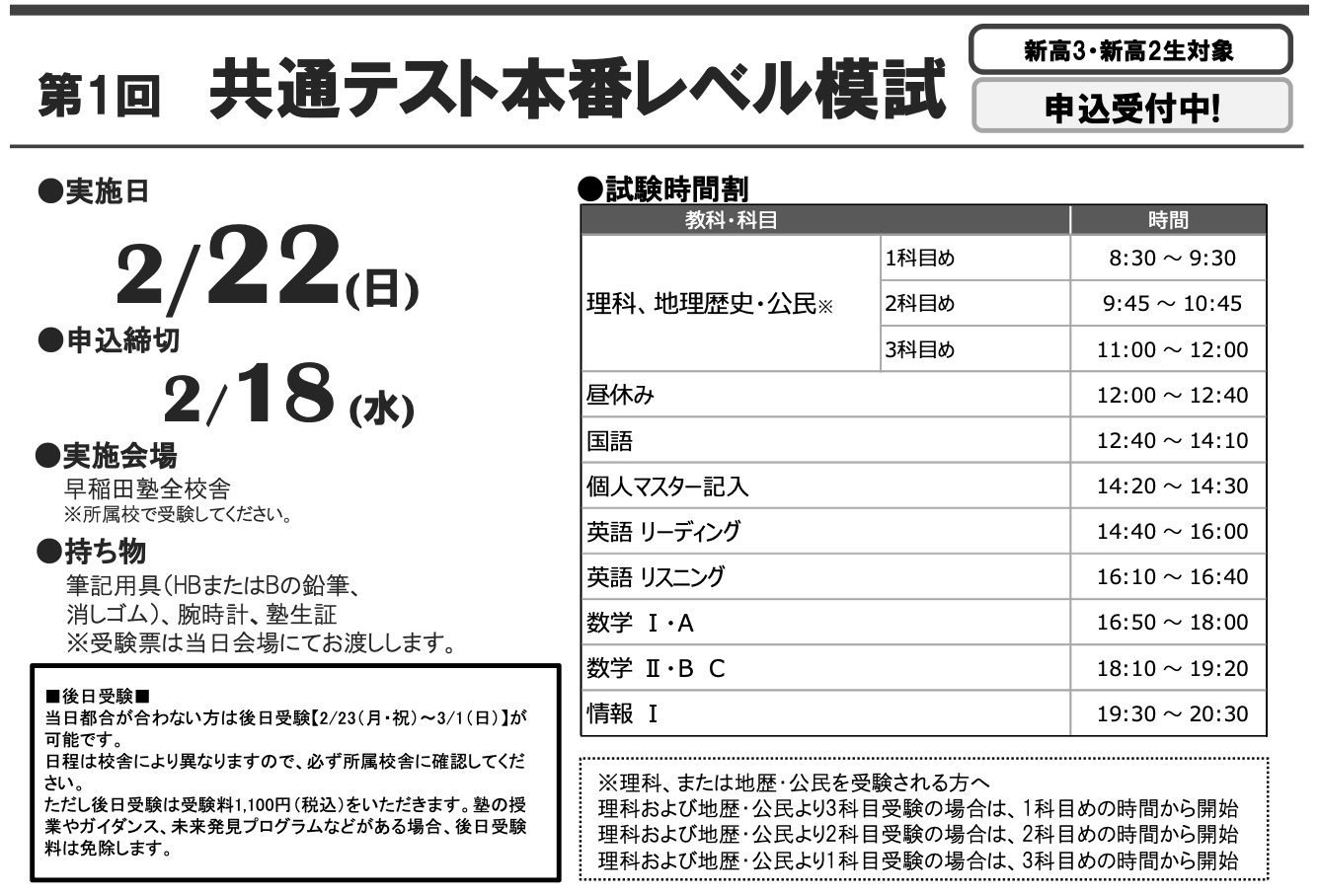 今週の2/22(日)に第一回共通テスト本番レベル模試があります。こちらの申し込みはもうできていますか?