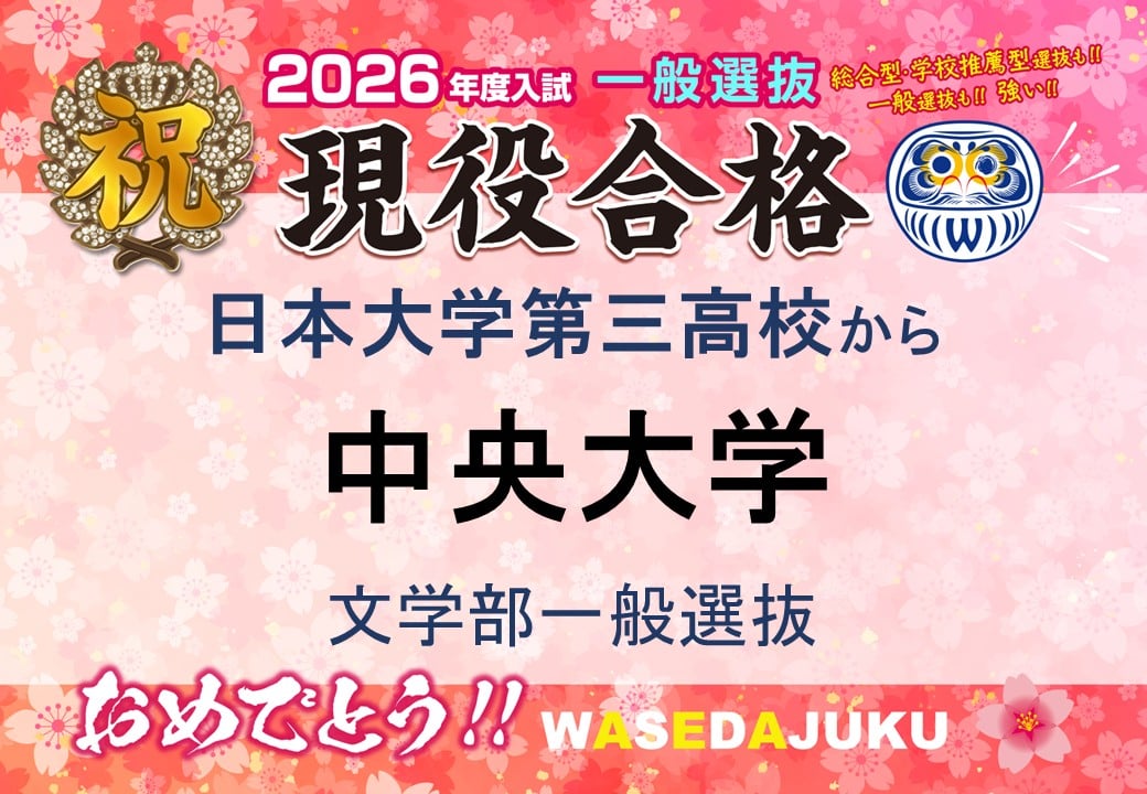 【合格速報】日本大学第三高校から中央大学文学部に一般選抜で現役合格です!