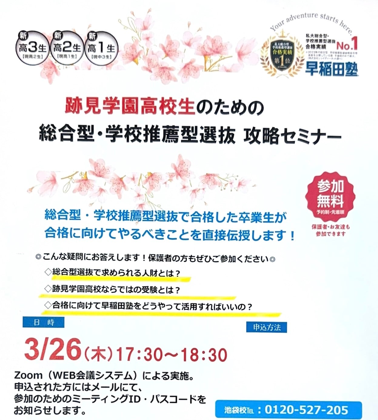 早稲田塾ならではの情報が盛りだくさんですので、跡見学園高校の皆様のご参加を心よりお待ちしています。