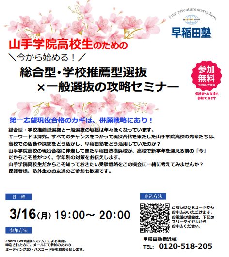 【山手学院高校生のための今から始める総合型・学校推薦型選抜 ×一般選抜の攻略セミナー】のお知らせ
