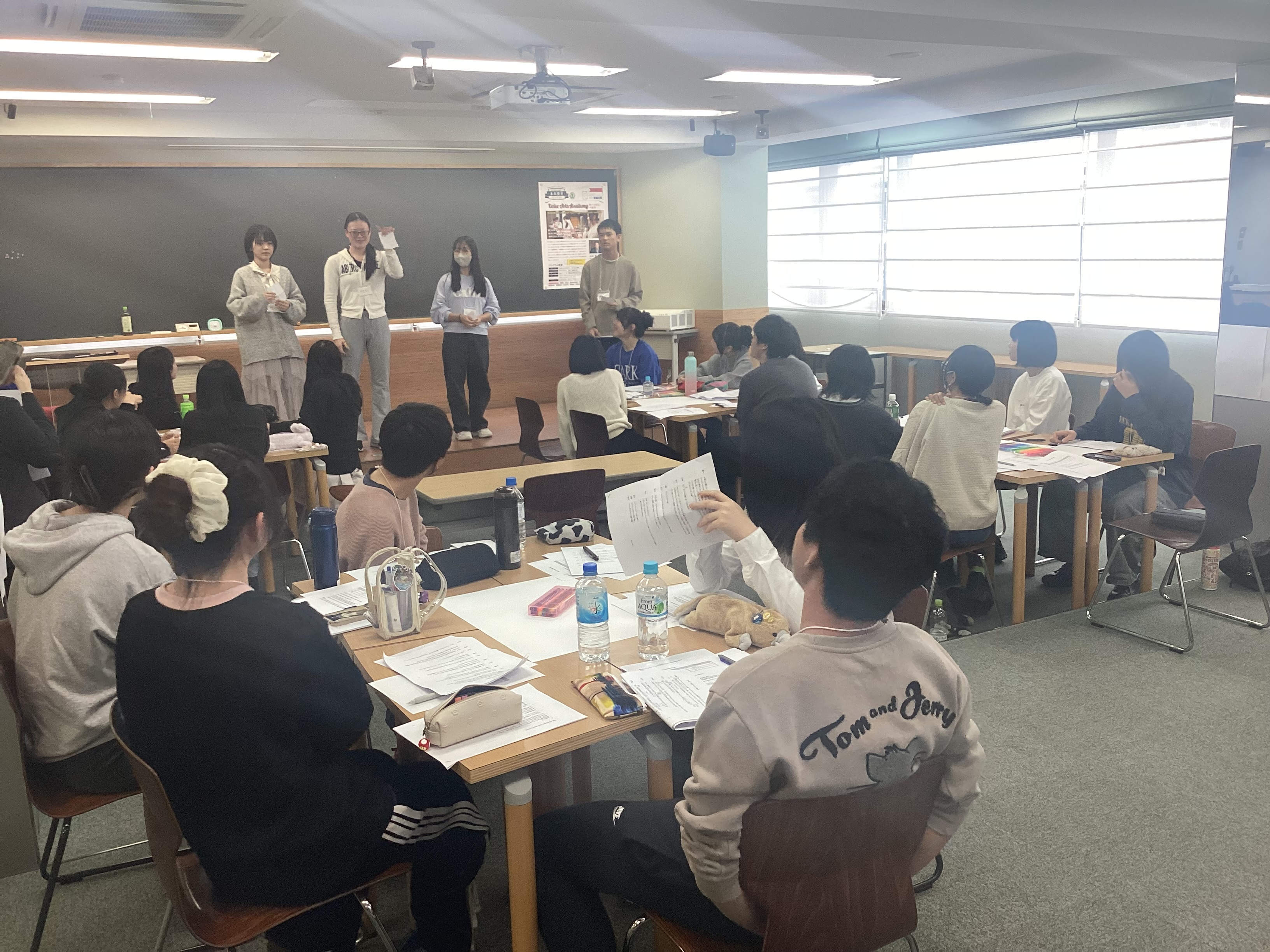 本日は一つの文章を一人ずつ交代で読んでいき、発音の伸びや抑揚、発声の仕方などをつかんでいきました!また、後半は班のみんなで演出をしてみました!