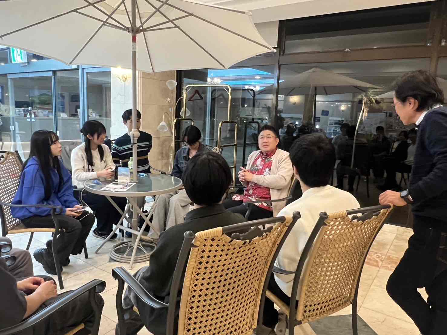 ホテル到着後も日付が変わるまでホテルの支配人さんに意見を聞くメンバーたちも。なぜ八丈島に来ることになったのかから始まり、それぞれのグループが考えていることを伝えながら、八丈島にお住まいの方のリアルな声を聞かせていただきました。実際に話を聞いてみると、やはりウェブで調べているだけではわからない、初めて聞く情報がたくさん出てきます。フィールドスタディーの醍醐味であり、このプログラムの大切な3つのポイントのうちの一つ「思い込みを疑う」ことの重要性を改めて実感したのではないでしょうか。