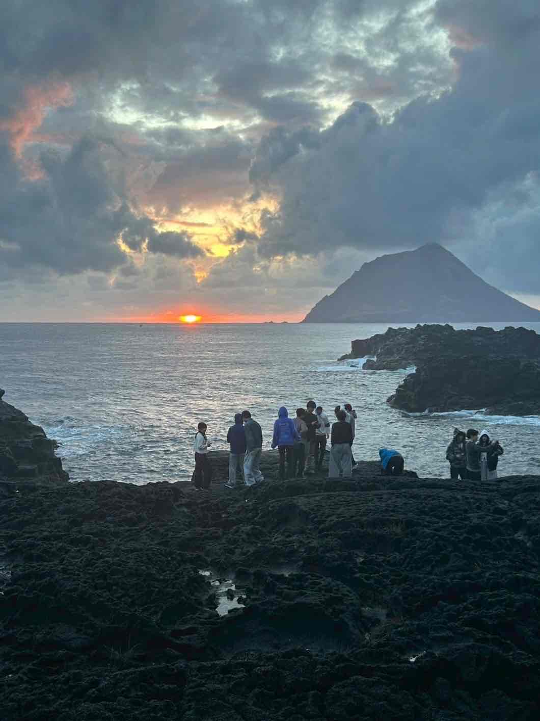 夕方八丈島空港に到着。その後は南原海岸に向かいます。到着時は雨でしたが、ギリギリきれいな夕日を見ることができました!遥か彼方の水平線と夕日。島でしか見られない絶景で、塾生たちは歓声を上げていました。