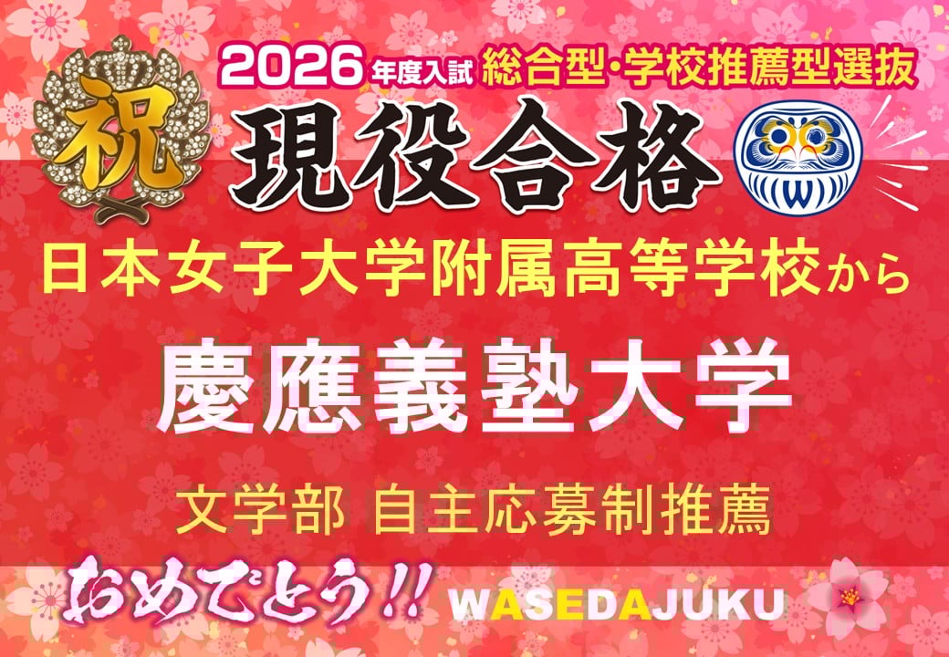 こんにちは!新宿校担任助手の杉井春希(東京都立大学法学部1年)です。現高校3年生から新宿校に嬉しいお知らせが続々と届いています!日本女子大学附属高等学校から、慶應義塾大学文学部人文社会学科に総合型選抜(自主応募制推薦)で見事現役合格です!