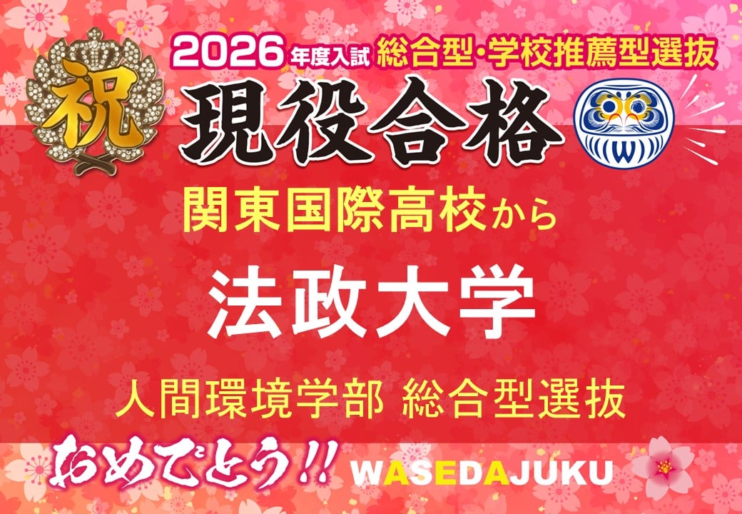 こんにちは!新宿校担任助手の杉井春希(東京都立大学法学部1年)です。現高校3年生から新宿校に嬉しいお知らせが続々と届いています!関東国際高校から、法政大学人間環境学部人間環境学科に総合型選抜(自己推薦入試)で見事現役合格です!
