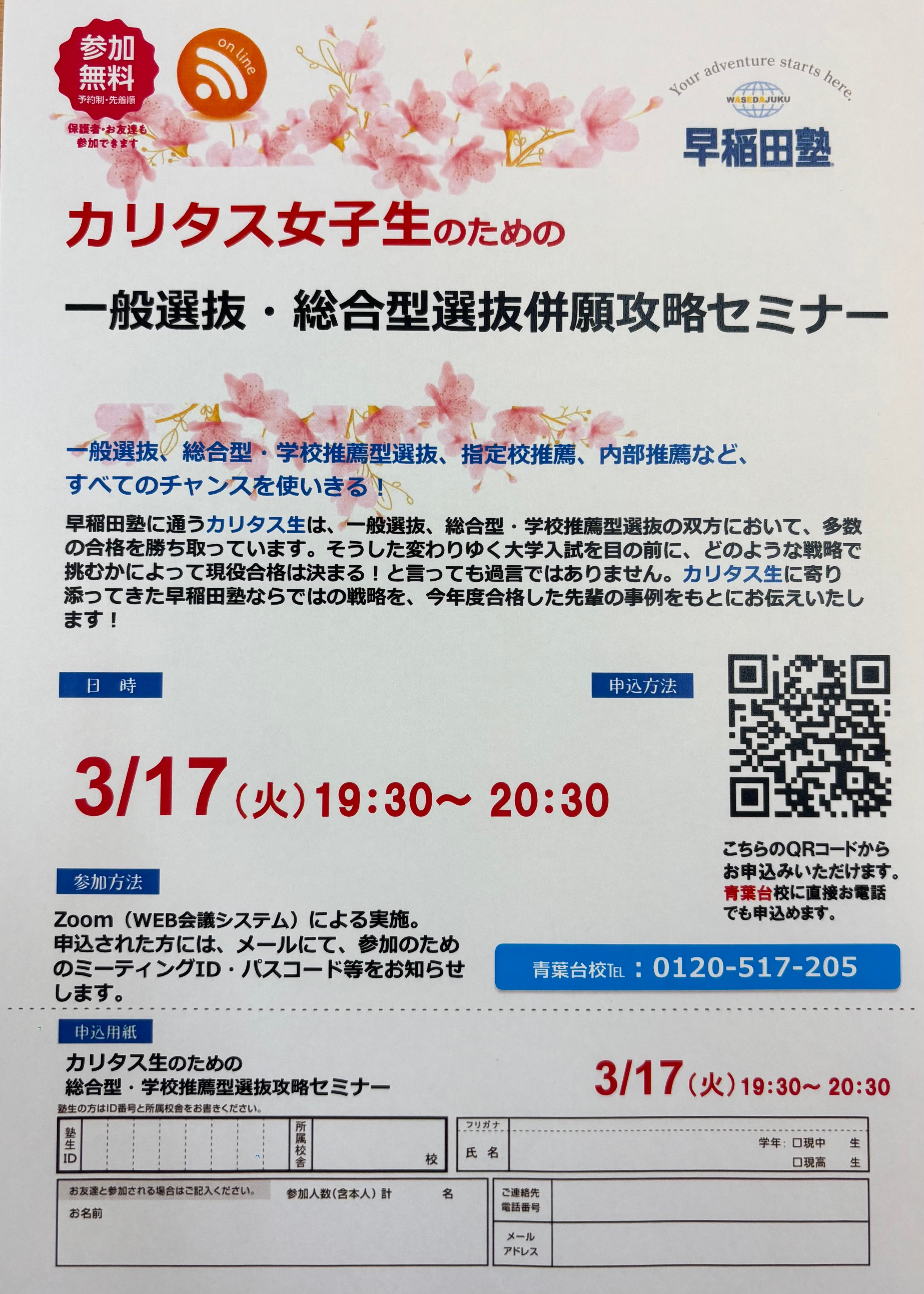 みなさんこんにちは。カリタス女子高校生の皆さんに嬉しいお知らせです。今回、「カリタス女子高校生のための総合型・学校推薦型選抜攻略セミナー」を開催が決定しました!