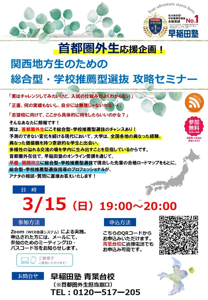 みなさんこんにちは。関西地方生のみなさんに必見情報です!首都圏外生応援企画!関西地方生のための総合型・学校推薦型選抜攻略セミナーを開催することが決定しました!ぜひご覧ください。