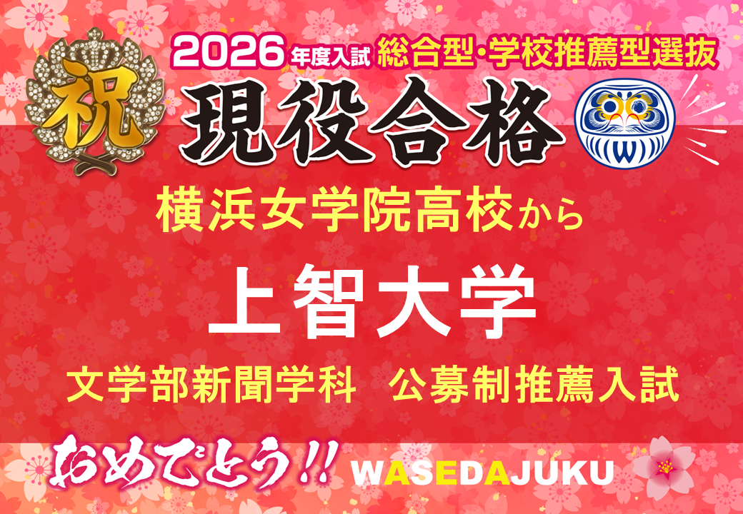 みなさんこんにちは。早稲田塾横浜校担任助手の波田野優子(横浜女学院高校卒・慶應義塾大学法学部政治学科4年・早稲田塾43期生)です。本日も、横浜校に届いた嬉しい合格報告を皆さんにお知らせします!