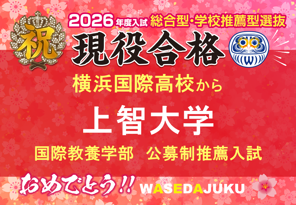 みなさんこんにちは。早稲田塾横浜校担任助手の高田真優(中央大学附属横浜高等学校卒・横浜国立大学経都市科学部2年・早稲田塾45期生)です。本日も、横浜校に届いた嬉しい合格報告を皆さんにお知らせします!