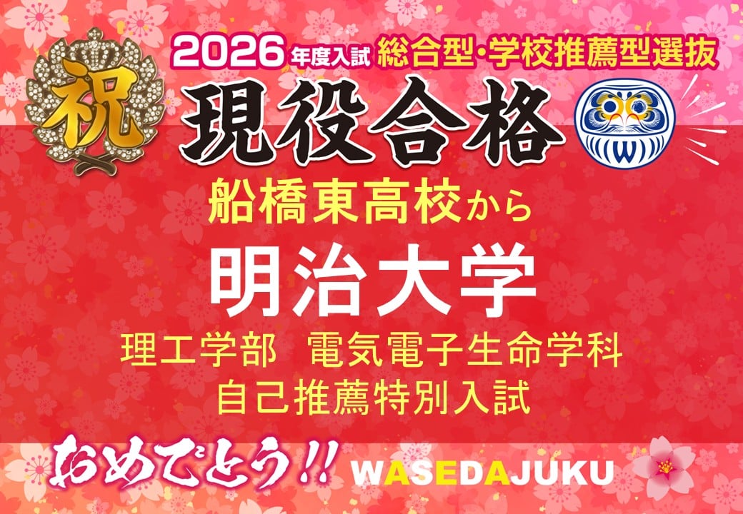 早稲田塾津田沼校より、現役合格速報です!県立船橋東高校から、明治大学理工学部へ自己推薦特別入試で現役合格!