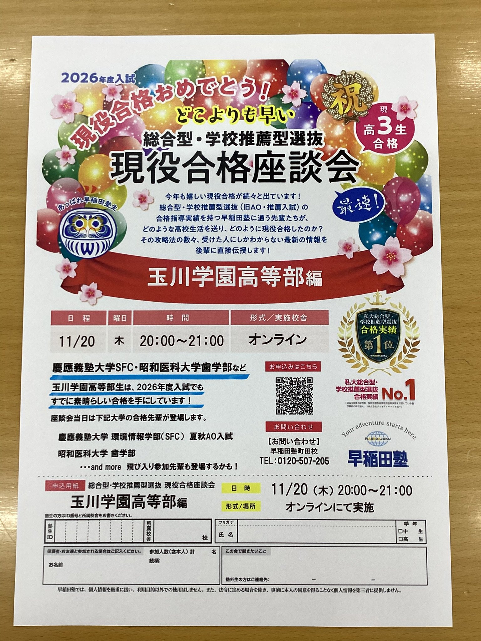 【玉川学園高等部生必見!】どこよりも早い 総合型・学校推薦型選抜 現役合格座談会 開催実施のお知らせ』