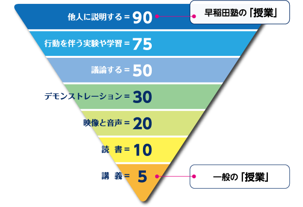 右の図は、アメリカの国立訓練研究所が提示した、学習の定着度を示した逆ピラミッドです。この図によると、ただ授業を一方方向で受けただけの学習の定着度はたったの「5」。効率よく学ぶには、「議論し、行動し、(習ったことを)人に教える」環境が必要だということがわかります。